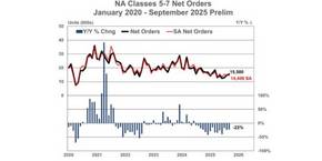 Preliminary data from ACT research shows North America class 8 truck net orders reached 20,800 units in September, down 44% year-on-year. On a seasonally adjusted basis, orders totalled 18,800 units, equal to an annualised rate of 225,000 according to Carter Vieth, research analyst at ACT research. Demand continues to fall amid the longest downturn for for-hire carriers, with freight rates running below inflation, ongoing tariff uncertainty and pending EPA 'low-NOx' regulation weighing on the market.